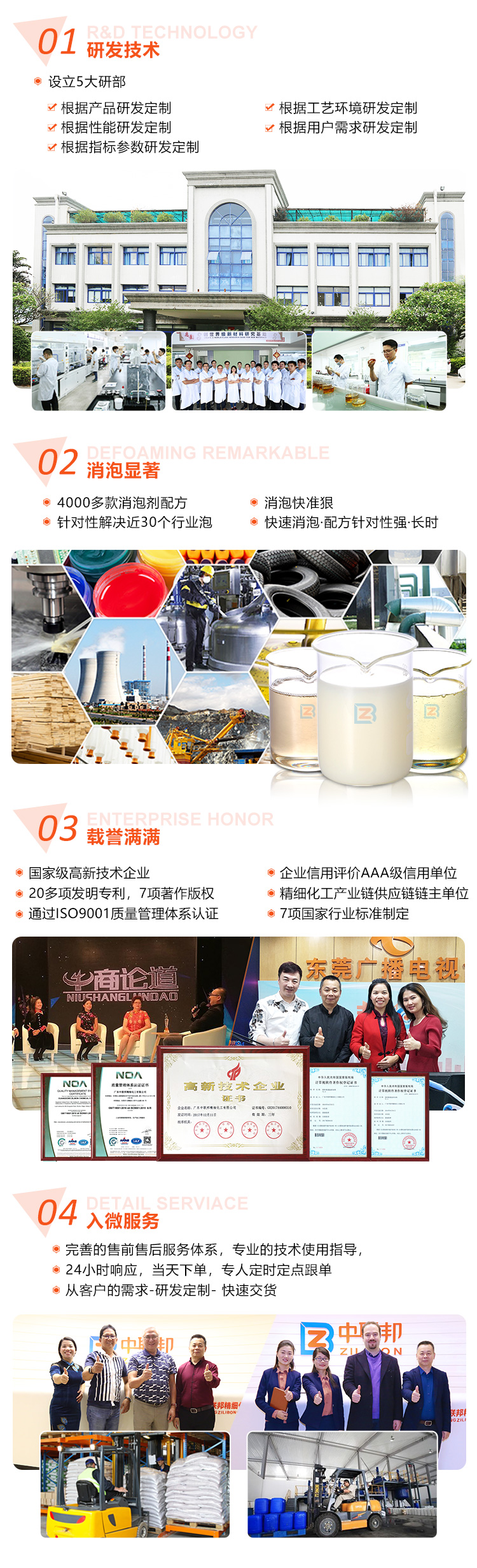 多年來公司面向市場,面向真實(shí)各行業(yè)客戶現(xiàn)場,對(duì)水處理消泡劑、工業(yè)消泡劑、有機(jī)硅消泡劑、發(fā)酵行業(yè)、清洗劑行業(yè)、金屬加工行業(yè)、造紙行業(yè)、建材行業(yè)、水性粘合劑行業(yè)、紡織印染行業(yè)、油田行業(yè)、水性涂料行業(yè)、印刷材料行業(yè)、電廠脫硫行業(yè)、工業(yè)清洗行業(yè)、家用化學(xué)品行業(yè)、采礦選礦工行業(yè)等32個(gè)行業(yè)工藝、流程及產(chǎn)品配方深入了解,對(duì)各行業(yè)消泡劑應(yīng)用了如指掌,給能客戶提供合適的解決方案,所研發(fā)生產(chǎn)消泡劑適應(yīng)客戶需求和市場需要,能輕松解決客戶遇到的難以解決的消泡難題,減少了客戶使用消泡劑的成本。公司依托完善的售前、售中及售后服務(wù),全程技術(shù)跟進(jìn)消泡劑的試樣到使用過程,節(jié)省了時(shí)間和成本,贏得了業(yè)界各類客戶們的贊譽(yù)!